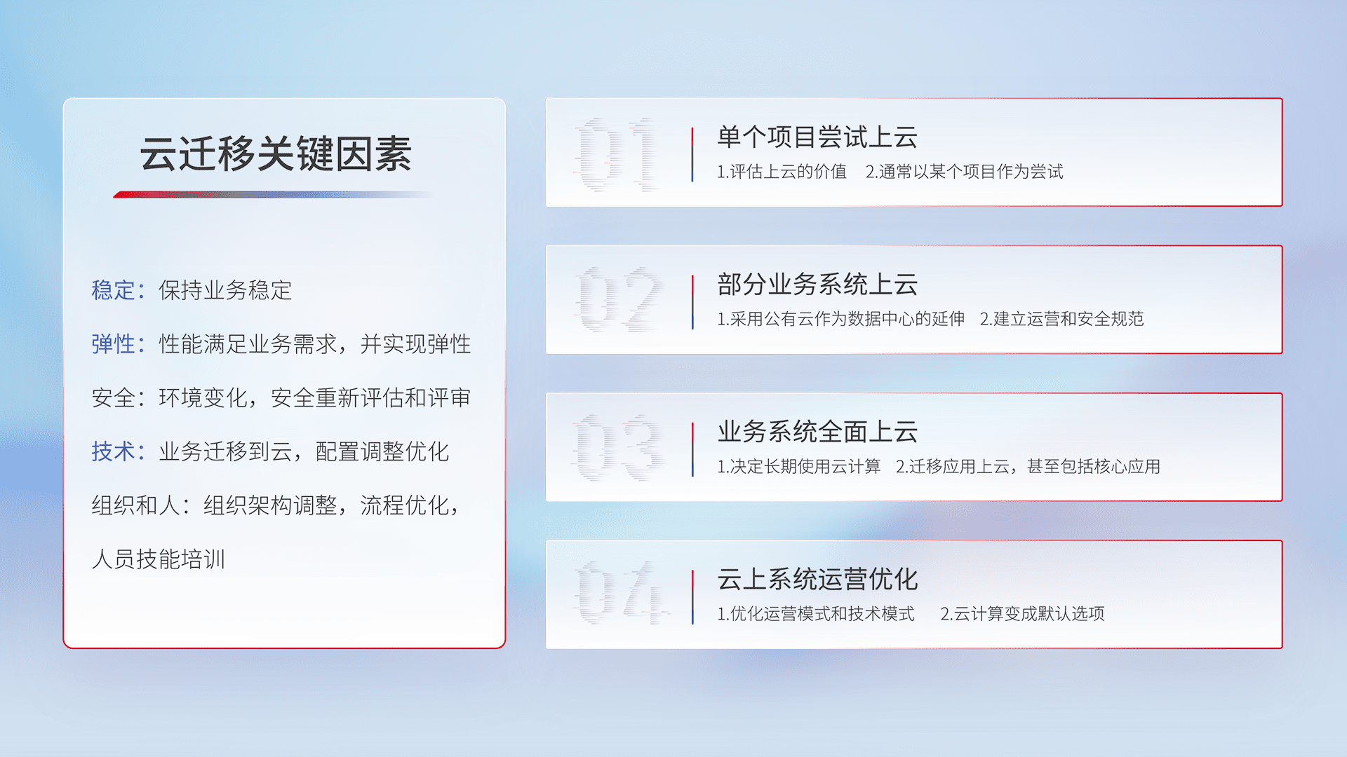 结合实际业务,,,从规划设计、、云平台选型、、、、云原生改造、、、、数据迁移、、、集成交付,,,迁移全过程为客户识别最佳上云路径,,,,做好风险识别管理,,,,设计网络架构、、、、身份权限、、、、安全审计合规、、、、操作审计、、、、日志审计、、、监控告警策略、、、多站点容灾设计等,,,,对云上基础设施进行整体规划,,提升IT治理水平,,以满足弹性、、、高可用、、、高性能的需求。。